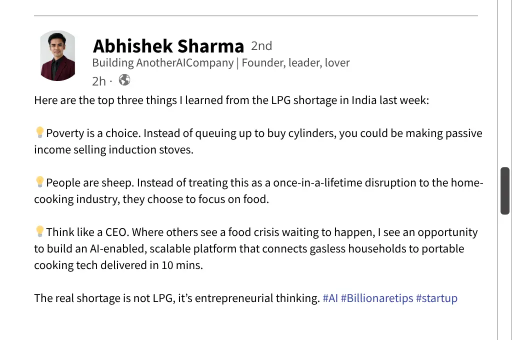 fake linkedin post by a fictitious person on the March 2026 LPG shortage in India--nonprofit humour
